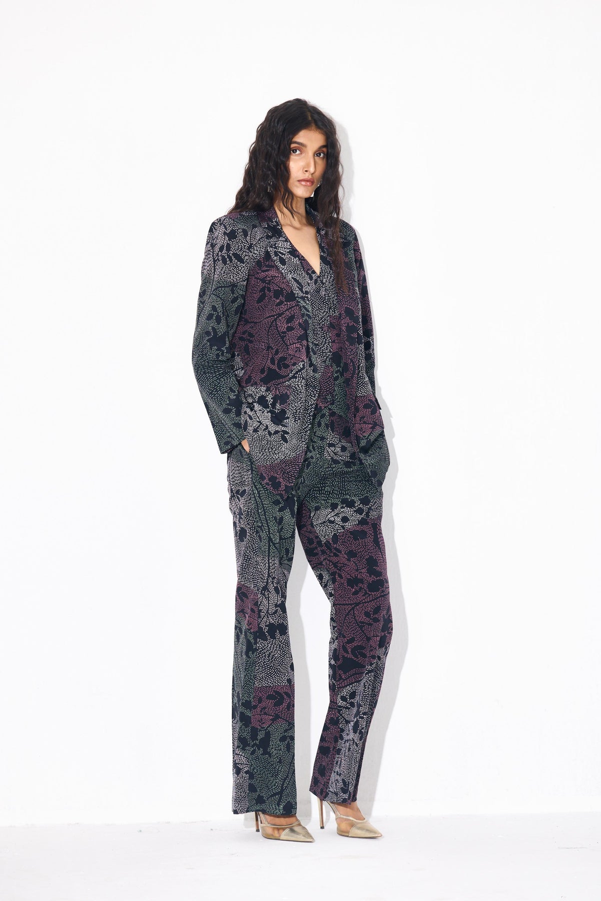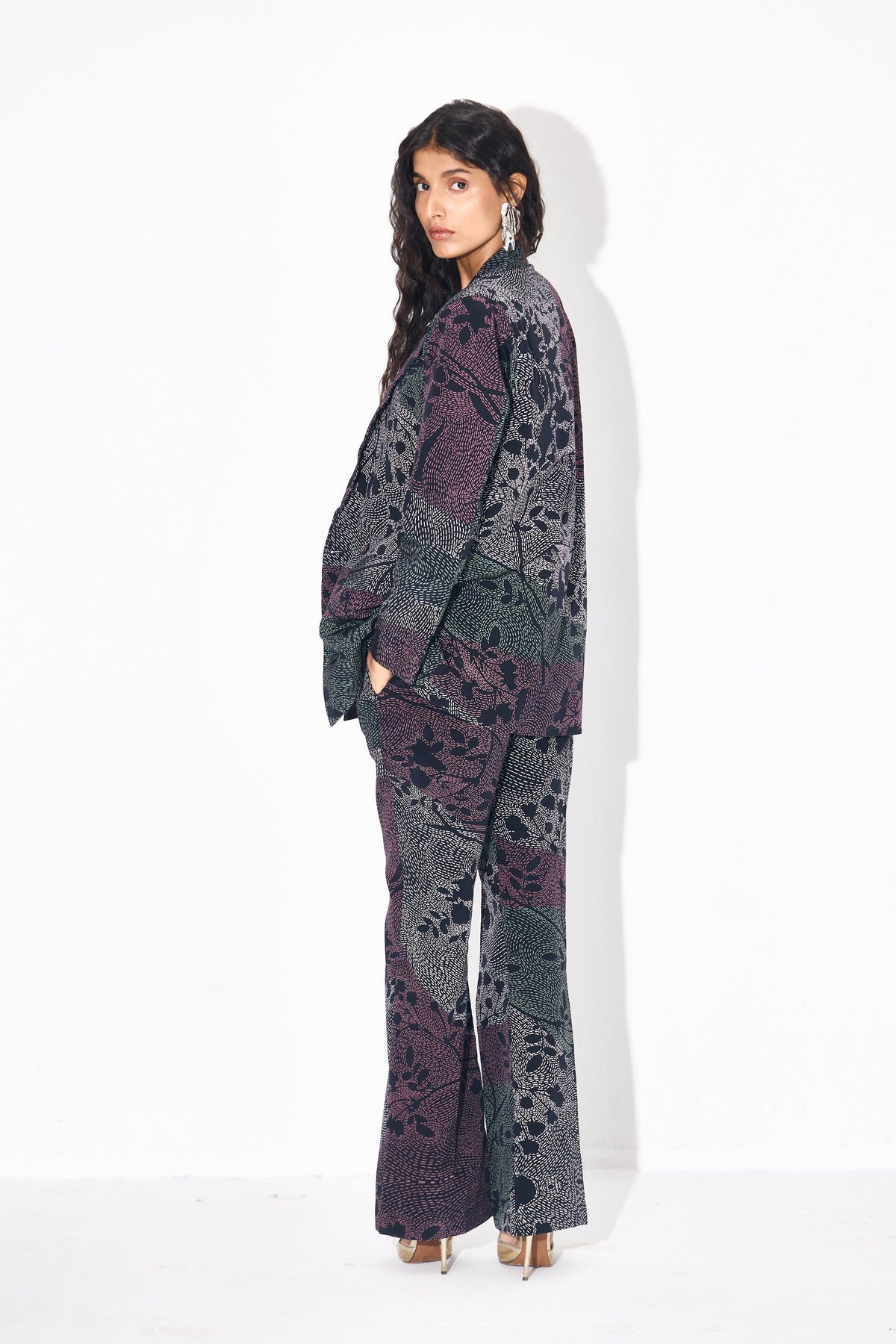PRINTED SET OF BLAZER, VEST AND FLARED PANT